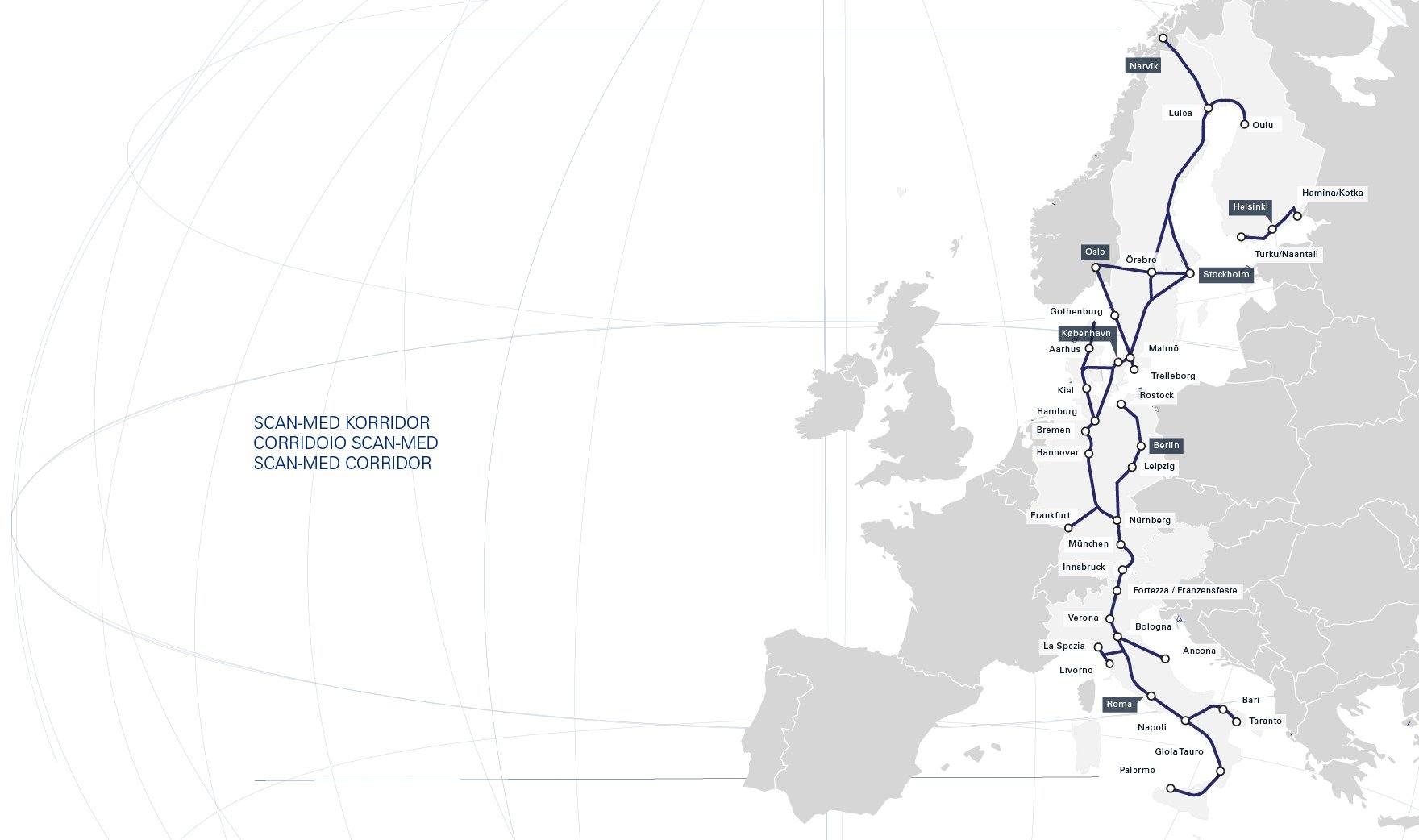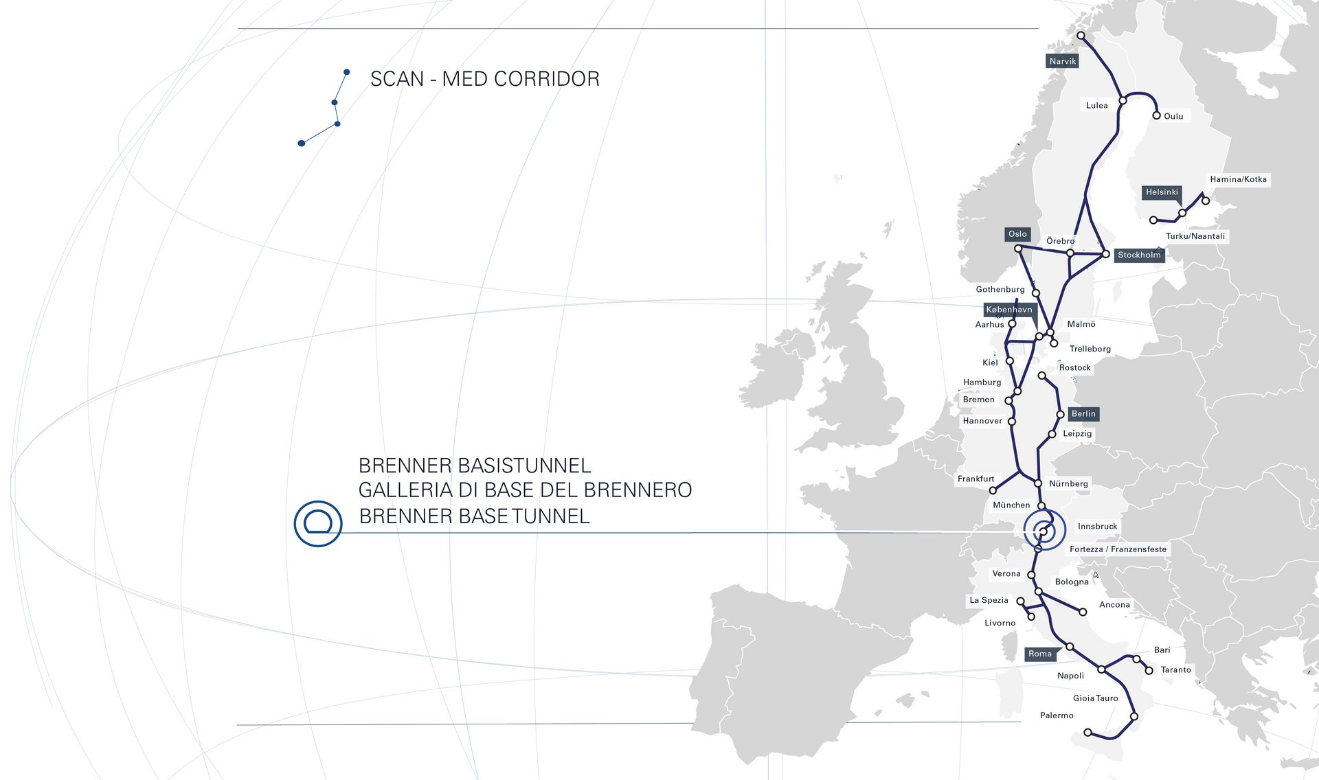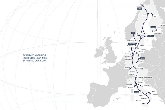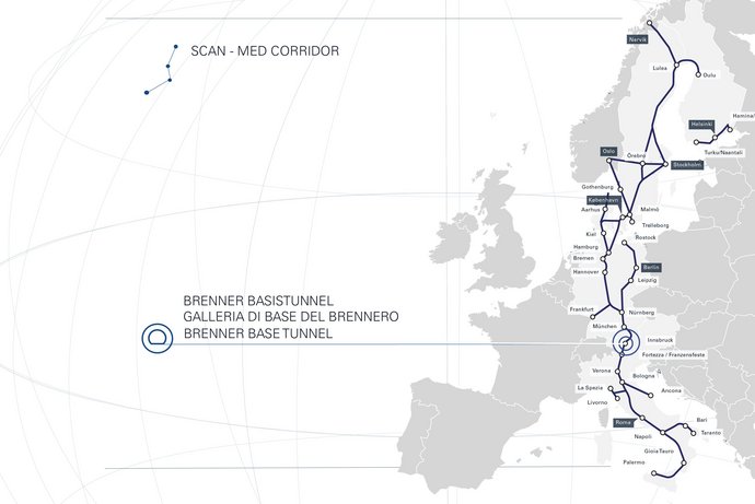 Der Brenner Basistunnel ist dem SCAN-MED Korridor zugeordnet. Dieser Korridor über 9.000 km lange Korridor zwischen Finnland und Malta verbindet urbane Zentren entlang der Strecke mit Häfen in Skandinavien und dem Mittelmeer.