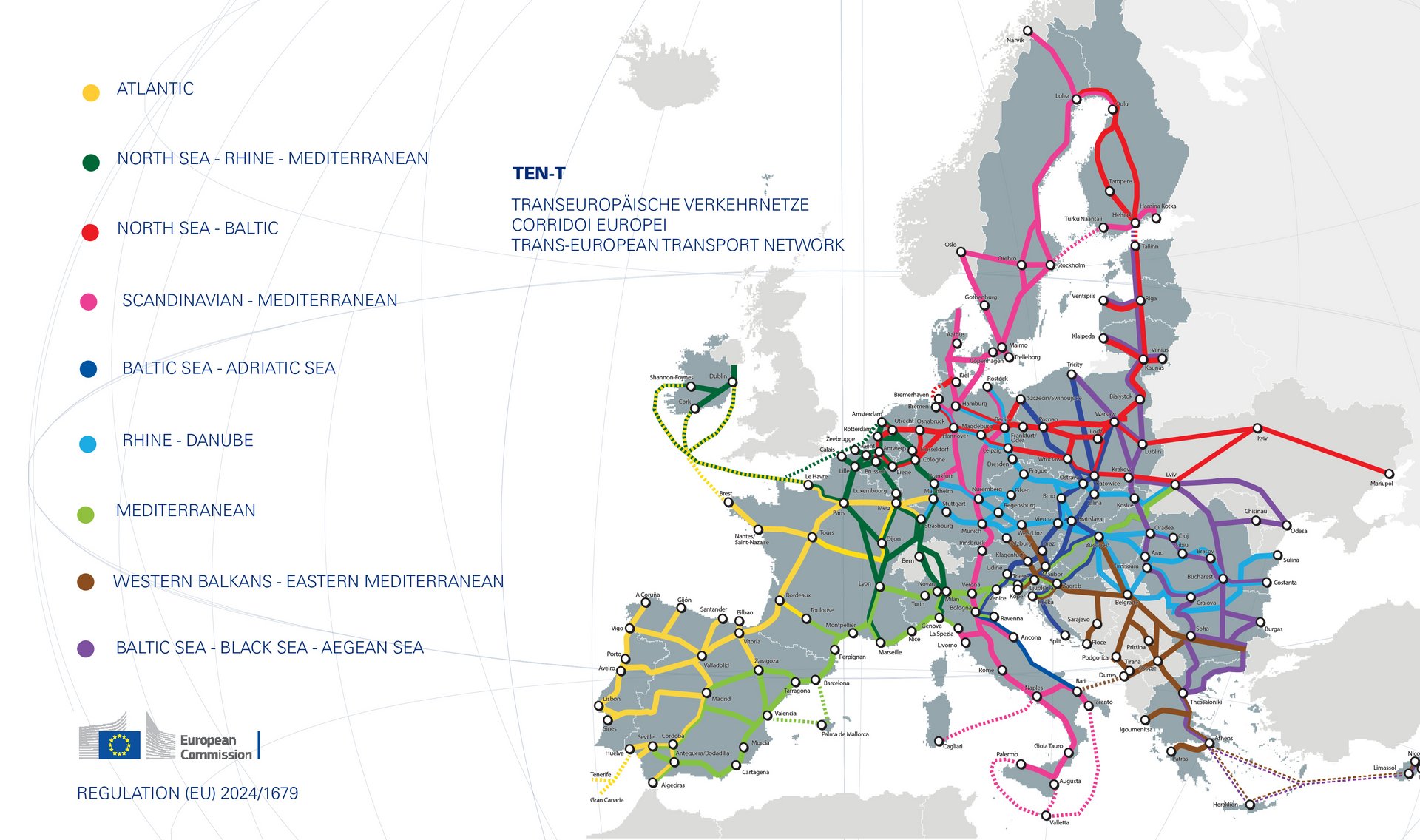 Im Dezember 2013 beschloss die EU, die TEN-Achsen in grenzüberschreitende, multimodale Verkehrsverbindungen auszubauen. Neun TEN-T Kernnetzkorridore verbinden nun die wichtigsten Seehäfen Europas mit der Eisenbahninfrastruktur und deren Anbindungen über die Straßen.