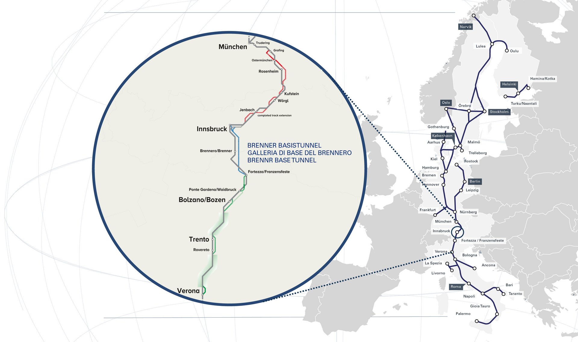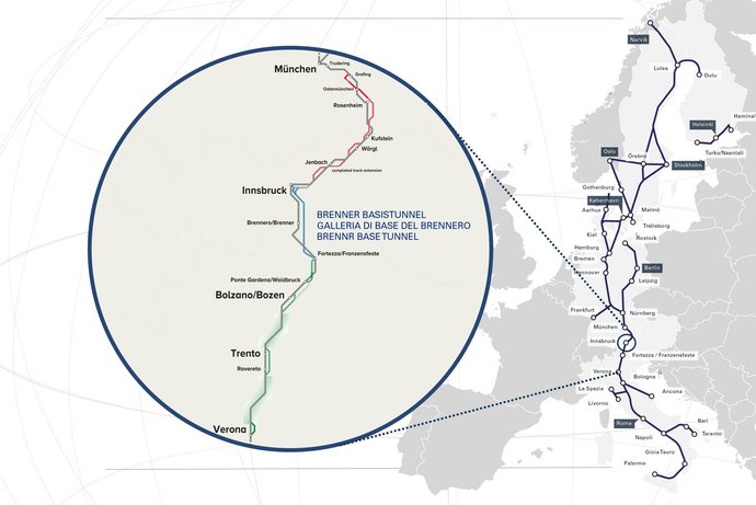 Der Bahnausbau am Brennerkorridor zwischen München und Verona ist umfasst insgesamt 435 km Neubaustrecke. Wesentlich dabei ist die grenzüberschreitende Zusammenarbeite. Sie ist Grundlage für ein moderne umweltfreundliche Bahnverbindungen im Herzen Europas. Der Ausbau der Eisenbahnachse München-Verona erfolgt schrittweise. Jedes Teilprojekt stärkt die Leistungsfähigkeit der gesamten Bahnverbindung.