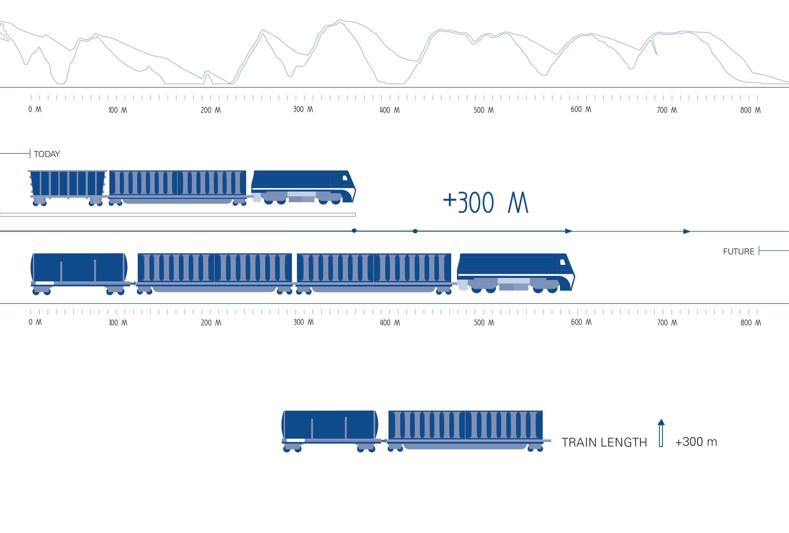 Dank des Brenner Basistunnels müssen Züge künftig nicht mehr die steile und kurvenreiche Strecke über die Alpen nehmen. Stattdessen fahren sie fast gerade und auf einer nahezu flachen Strecke durch den Berg. Dadurch können längere und schwerere Züge eingesetzt werden, was den Transport einfacher und effizienter macht. Somit wird die Schiene zu einem wettbewerbsfähigen Verkehrsträger und eine valide alternative zum Güterverkehr auf der Straße.
