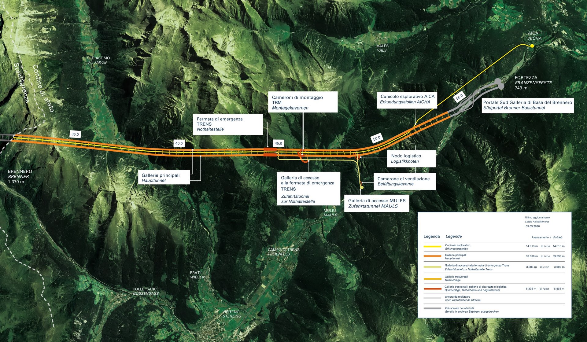 MASCHINELLER VORTRIEB: Der maschinelle Vortrieb begann im Jahr 2018: Im Mai machte sich die Tunnelbohrmaschine „Serena” auf ihre rund 14 Kilometer langen Weg durch den Erkundungsstollen Richtung Norden bis zur Staatsgrenze am Brenner, die sie im November 2021 erreichte. Im Frühjahr 2019 starteten die beiden TBM „Virginia” und „Flavia” im jeweils 14 km langen Haupttunnel Ost bzw. West ihre Reise Richtung Norden zum Brenner. Während „Virginia” im März 2023 den Brennerpass erreichte, kam „Flavia” im Mai 2025 an der Staatsgrenze an.